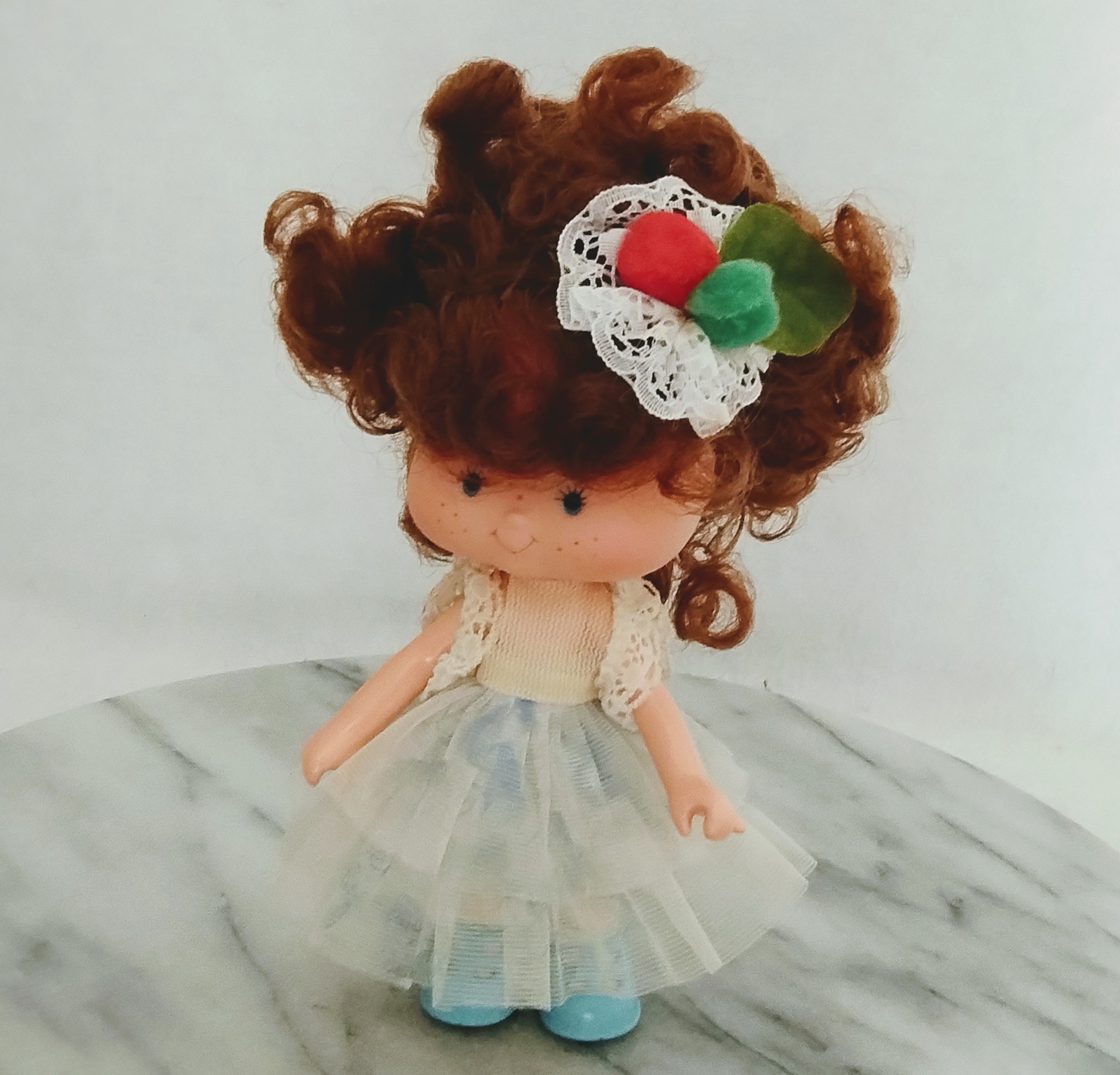 Produto usado, higienizado, vendido precificado no estado : falta o colar de correntes coloridos e as frutas na renda do cabelo. Os oinpons são improvisados